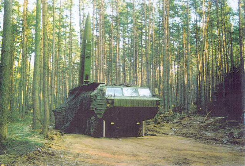 Das Foto zeigt eine Startrampe des operativ-taktischen Raketenkomplexes 9K714 mit der Rakete 9M714 (NATO-Code: Spider, DIA-Code: SS-23) beim Feuerdienst im Raketenausbildungsgelände der 5. RBr. Bilder wie dieses waren bis zur Abrüstung des Systems Anfang 1990 streng geheim. Selbst GVS-verpflichtete Angehörige anderer Raketenabteilungen durften die Rakete nicht außerhalb des Transportfahrzeuges bzw. der Startrampe sehen.