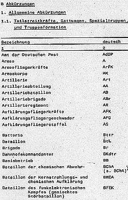 Die Abkürzungen der Namen der Truppenteile/Einheiten/Einrichtungen wurde durch Vorgaben in den Katalogen der 046'er Reihe geregelt.