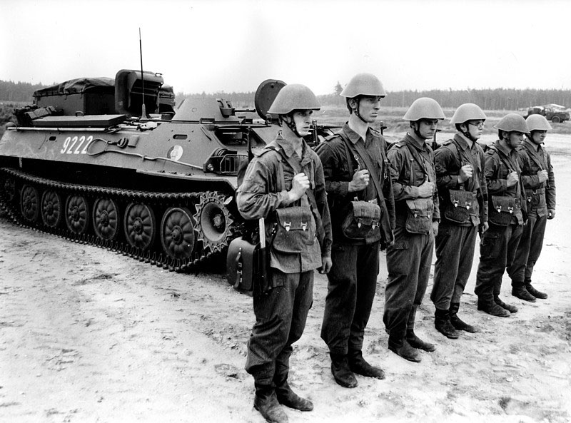 Im Bild eine angetretene Pioniergruppe vor dem Gefechtsfahrzeug MTLB. Dieser war für den Einsatz in den Pioniertruppen mit einem Container versehen worden, in welchem Sprengstoff und andere Pionierausrüstung transportiert wurde. Zur Pioniergruppe gehört neben dem Gruppenführer (Uffz.) noch 5 bis 6 Pioniere und der MTLB-Fahrer (ebenfalls Uffz.)