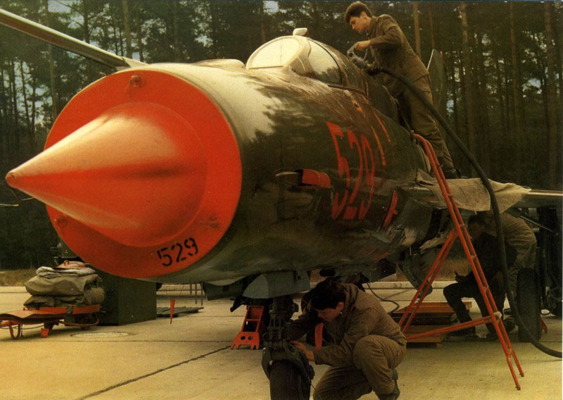 Unteroffiziersschüler der MTS "Harry Kuhn" in Bad Düben bei der Ausbildung an einer MiG-21 MF. Dieses Flugzeug befand sich seit April 1974 im Einsatz beim Jagdfliegergeschwader 9 und wurde nach einer Havarie im September 1980 aus dem aktiven Flugdienst des Geschwaders herausgelöst. Seitdem diente die Maschine zu Ausbildungszwecken auf dem Lehrflugplatz der MTS.