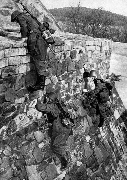 Offiziersschüler während der Geländeausbildung beim Erklettern eines Brückenbogens(?). Damals wurden zur Felddienstuniform noch zahlreiche Ausrüstungsgegenstände, wie Kochgeschirr, Zeltbahn usw. getragen
