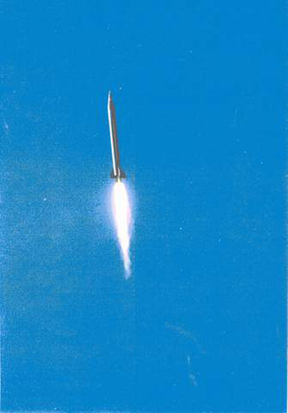 Es zeigt eine operativ-taktische Rakete 8K14 wenige Sekunden nach ihrem Start auf dem Staatspolygon der ehemaligen UdSSR bei Kapustin Jar. Die leichte „Schlagseite“ der Rakete ist auf die beginnende Arbeit der Programmeinrichtung zurückzuführen, die die Rakete in der Ebene zum Ziel letztendlich um 45° neigen wird.
