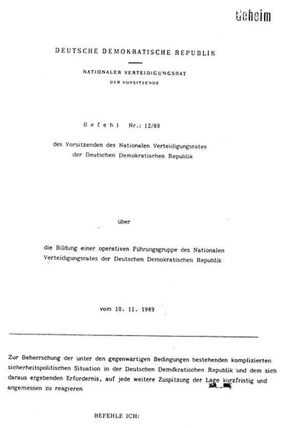 | Faksimile | Befehl Nr. 12/89 des Vors. des Verteidigungsrates der DDR (3 Seiten) |