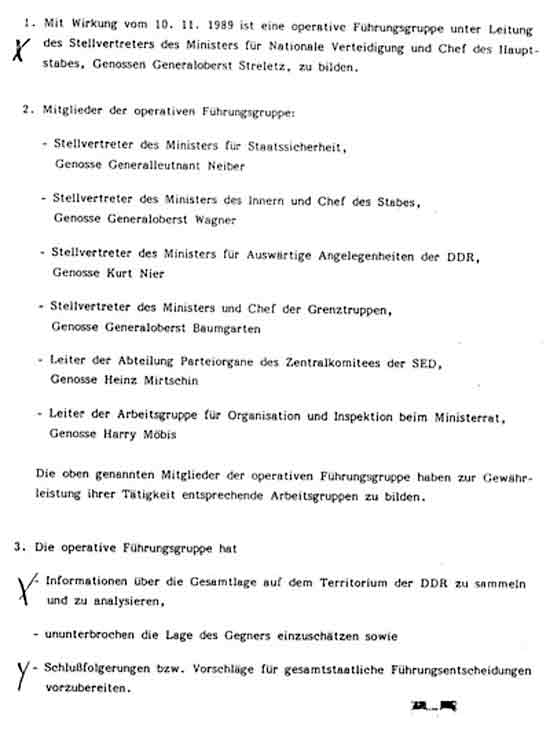 des Vorsitzenden des Nationalen Verteidungsrates der Deutschen Demokratischen Republik über die Bildung einer operativen Führungsgruppe des Nationalen Verteidungsrates der Deutschen Demokratischen Republik vom 10.11.1989. Zur Beherrschung der unter den gegenwärtigen Bedingungen